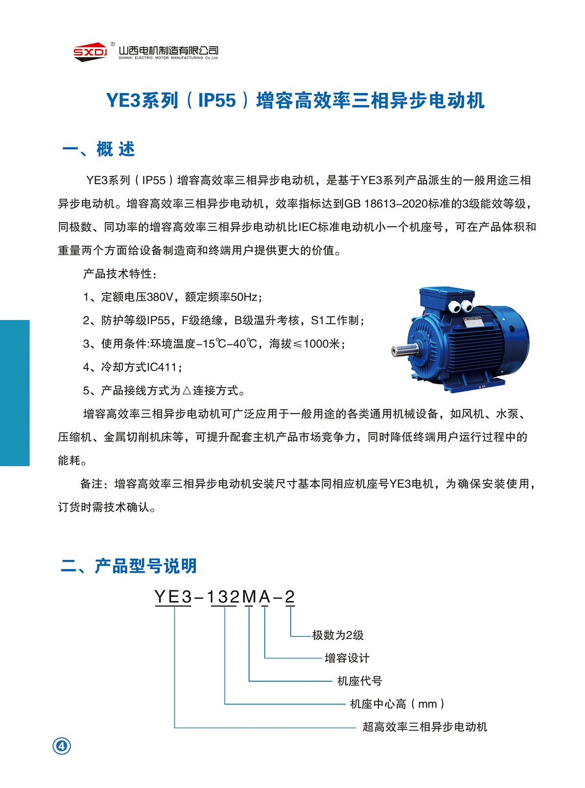 封閉式自扇冷卻籠型轉(zhuǎn)子高效三相異步電動機,設(shè)計符合IEC、GB等相關(guān)標(biāo)準(zhǔn)要求。YE3系列(IP55)增容高效率三相異步電動機,效率指標(biāo)達到GB18613-2020《電動機能效限定值及能效等級》中3級能效水平。